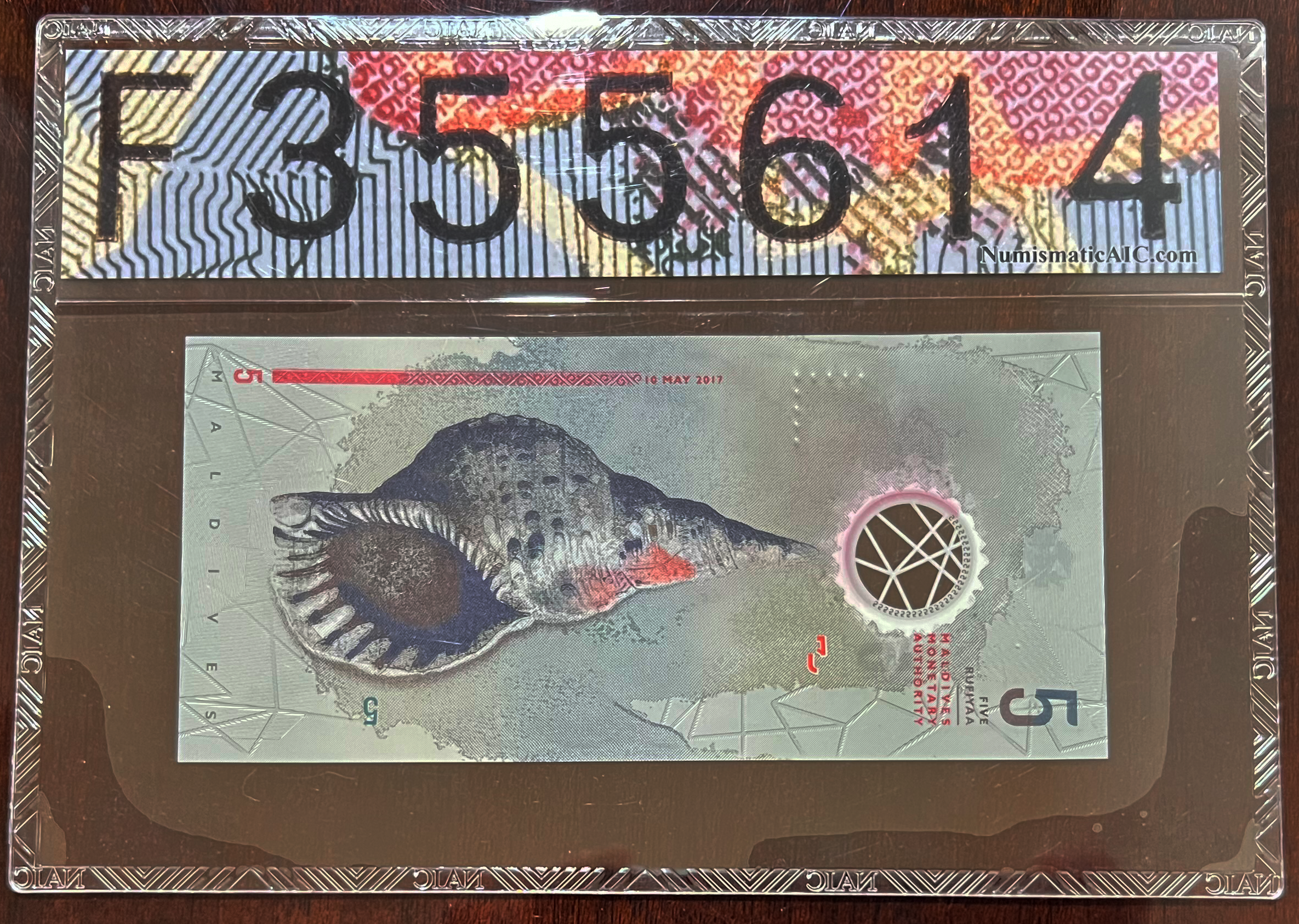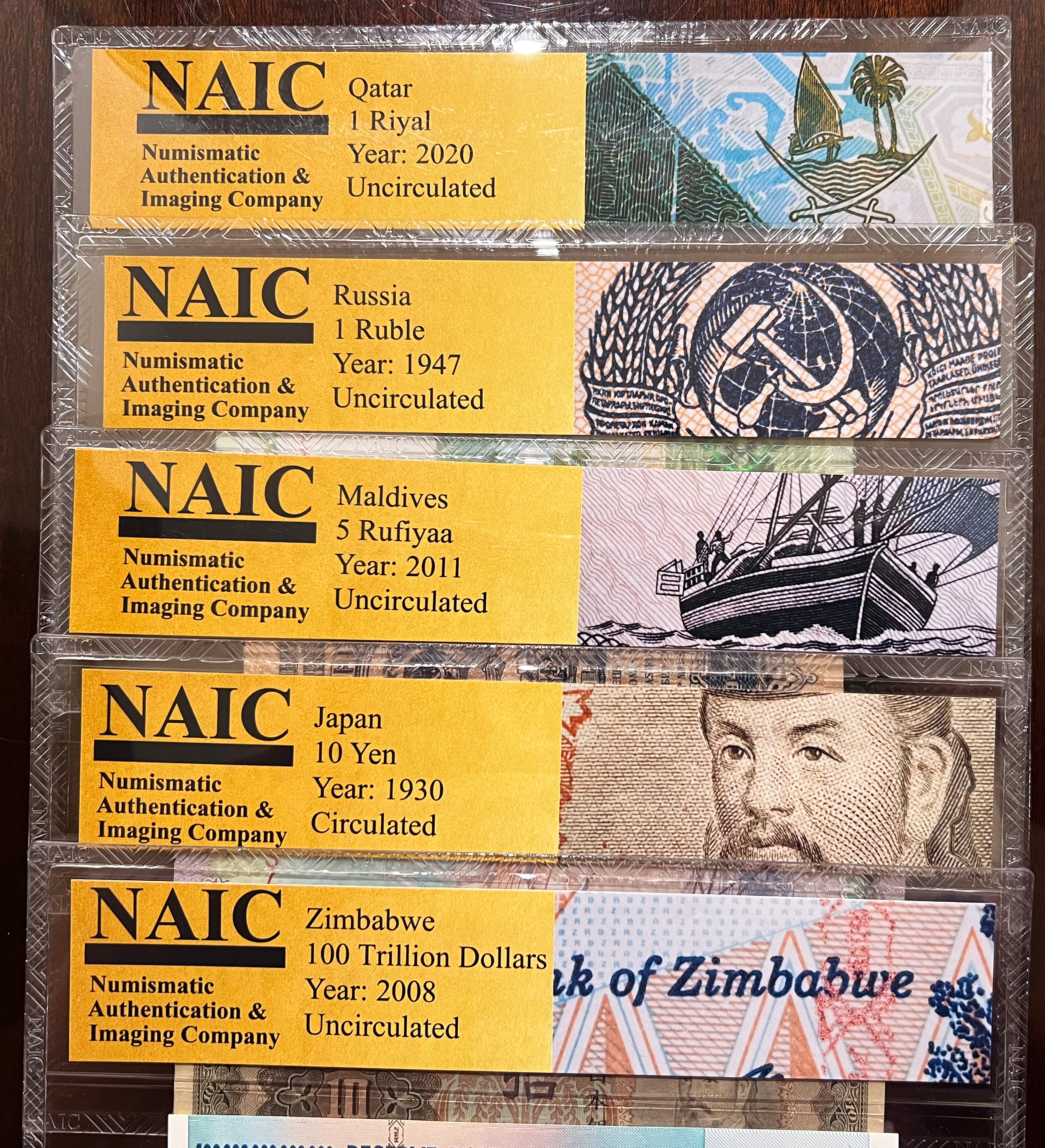 On the reverse side of each label, a magnified image of the banknote’s serial number, enlarged nearly 2000 times, reveals intricate details while confirming authentication by NAIC.
